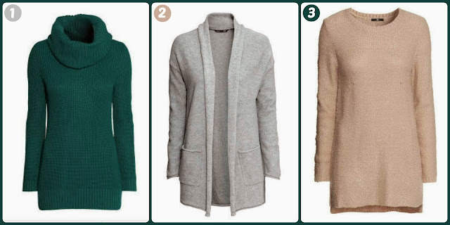 | 1. Green Sweater | 2. Gray Cardigan | 3. Beige Sweater |